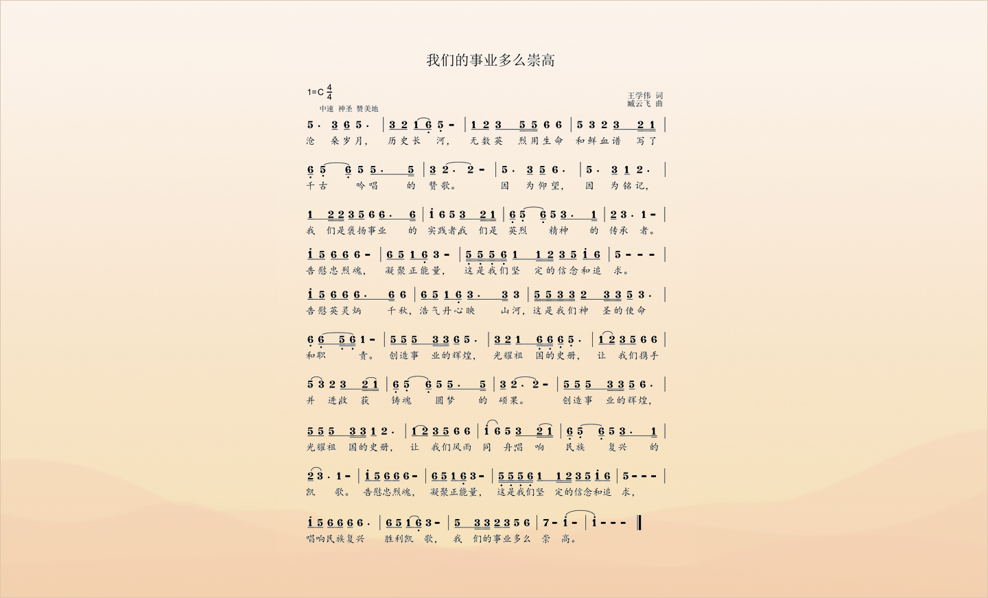 會歌旨在以永不消逝的旋律歌頌和銘記英烈事跡,傳承和弘揚(yáng)英烈精神。從歌詞到樂譜體現(xiàn)中華英烈不怕犧牲、不為艱險(xiǎn)的英雄氣概,深情謳歌中華英烈用赤膽忠心鑄就勝利榮光、捍衛(wèi)祖國尊嚴(yán)的偉大壯舉。歌詞簡約大氣,力求抒發(fā)中華英烈褒揚(yáng)事業(yè)的神圣和崇高。樂曲旋律深情飽滿、昂揚(yáng)豪邁,力求每一個音符都撞擊聽眾靈魂,切身感受中華英烈感動天地、氣壯山河的高貴品格,呼喚和感召世人傳承英烈志、凝聚民族魂、共圓中國夢。